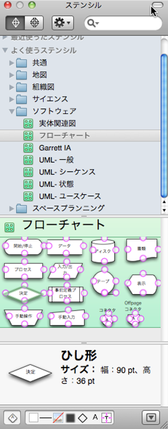 OmniGraffle Proでは、よく使う項目は「お気に入り」として登録できたり、パーツ同士を組み合わせて切り抜いて新たな形を作る「合成」機能が搭載されています。より効率良く図形を作成できるよう工夫されていると言えます。また、Microsoft Visioのテンプレートやステンシル、Visioで作成したファイルを利用することが可能となっています。