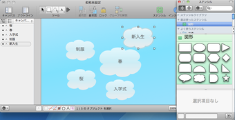 OmniGraffle Proのメイン画面は、画面上部のアイコンメニュー、画面左のアウトラインと図形を描写するキャンパスで構成されています。OmniGraffle Proには「ステンシル」というパーツ(図形や吹出しなどの簡単なイラスト)が豊富に用意されています。スペース設計のための机や壁、ドアなどのアイテム、プロジェクトマネジメント用のフローチャート用のアイテムなどが用意されており、パーツをドラッグ&ドロップして配置するだけで、思った通りの図式を作成できます。マインドマップ専用のツールよりも、マインドマップが簡単に作成できると感じるでしょう。